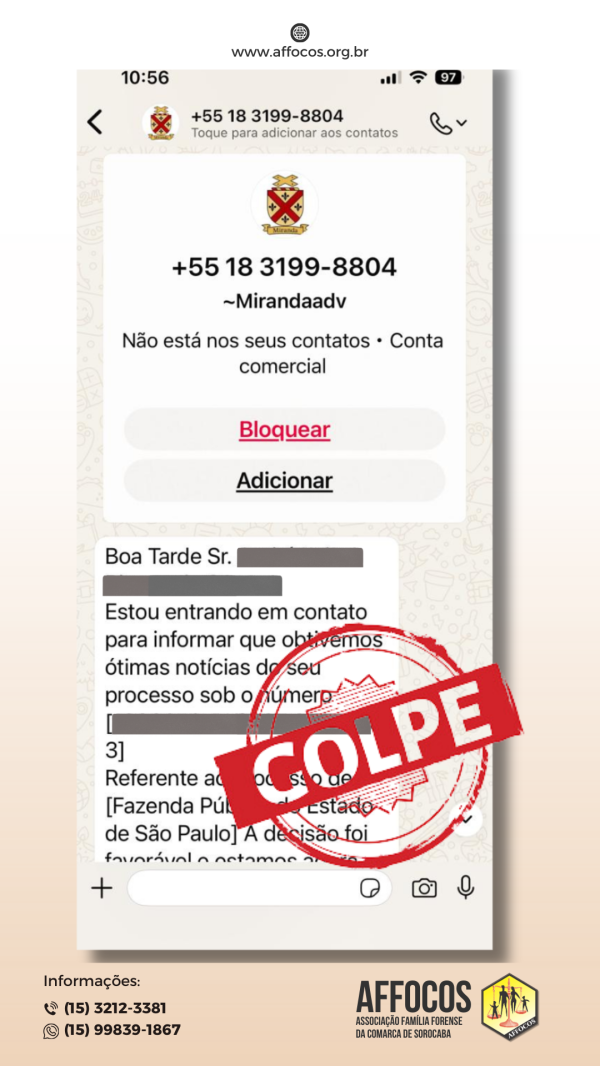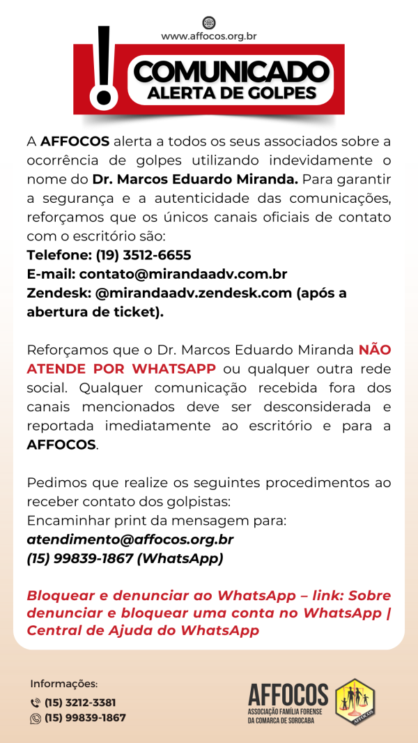 Reforçamos que o Dr. Marcos Eduardo Miranda NÃO ATENDE POR WHATSAPP ou qualquer outra rede social. Qualquer comunicação recebida fora dos canais mencionados deve ser desconsiderada e reportada imediatamente ao escritório e para a AFFOCOS.