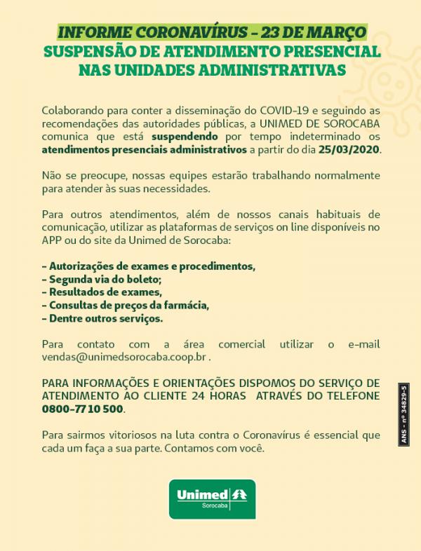 Suspensão de Atendimento Presencial Unidades Unimed Sorocaba