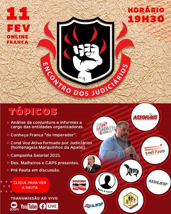 Encontro dos Judiciários realizado em Franca, interior do Estado, organizado pela AFFOCOS, AFOCA, AJESP, APATEJ, ASSISJESP, ASSOJURIS, FENAJUD, SINJURIS e SINSPJUD, reuniu virtualmente, na noite desta quinta feira, 11 de fevereiro, a partir das 19:30hs, trabalhadores do Poder Judiciário Paulista para discutir assuntos do interesse da categoria dos servidores do Tribunal de Justiça e deliberarem sobre a pré pauta reivindicatória.