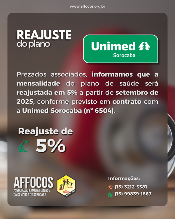Informamos que, conforme as tratativas realizadas entre a AFFOCOS e a Unimed Sorocaba, a mensalidade do plano de
