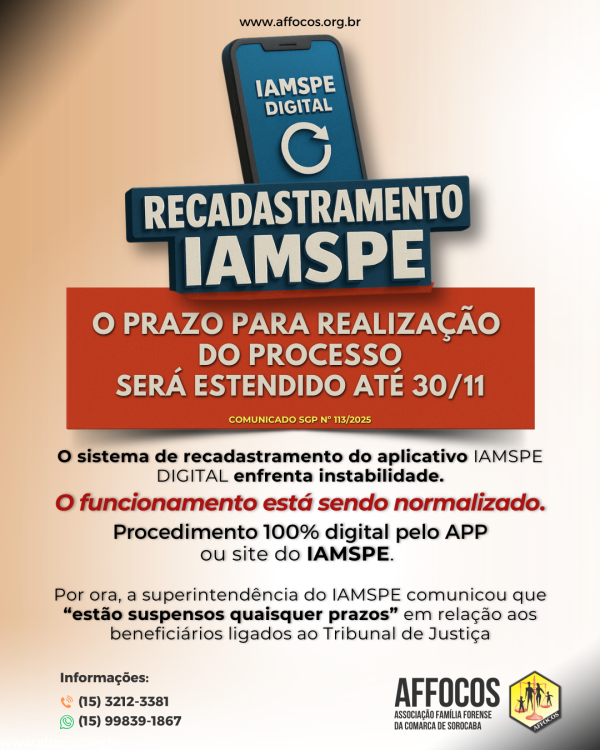 O recadastramento do IAMSPE não se confunde com o recadastramento anual obrigatório dos aposentados do TJSP, que permanece sendo feito no mês de aniversário, diretamente no banco em que recebem seus proventos, conforme o Comunicado da Presidência nº 192/2024.