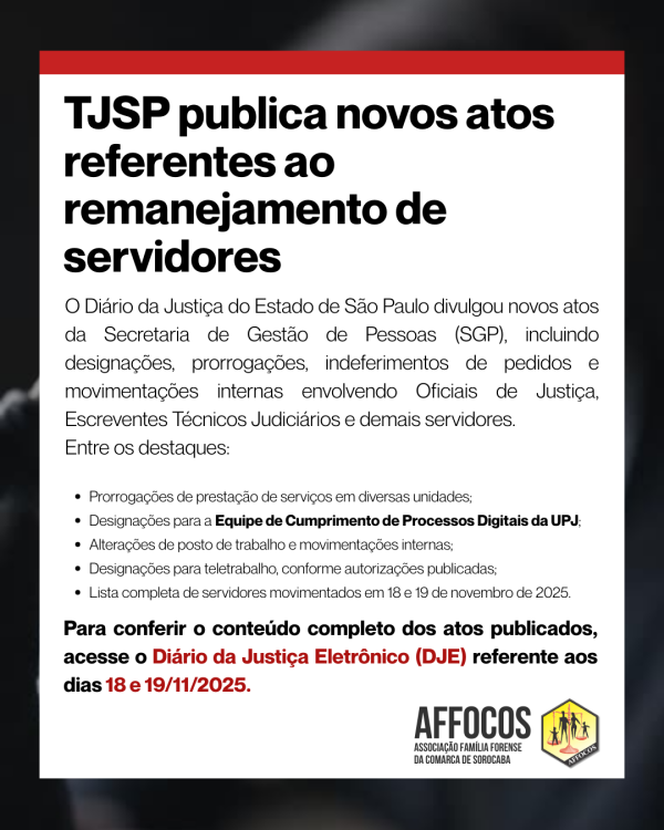 A AFFOCOS acompanha e divulga essas movimentações com o compromisso de manter a comunidade forense informada sobre as decisões que impactam diretamente o funcionamento das unidades judiciais e a atuação dos servidores.