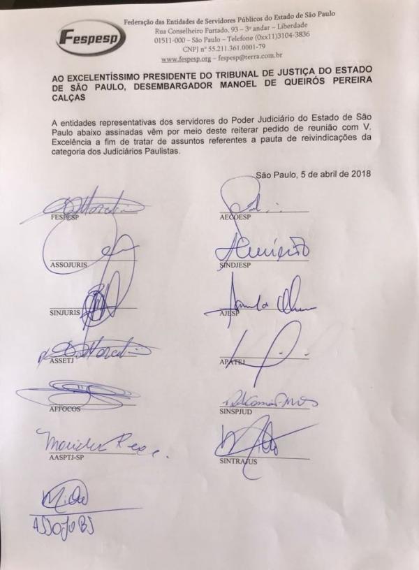 Que também terá como pauta às demais reivindicações, previamente encaminhada é de conhecimento do atual Presidente do Tribunal de Justiça do Estado de São Paulo, Des. Manoel Queiroz Pereira Calças.